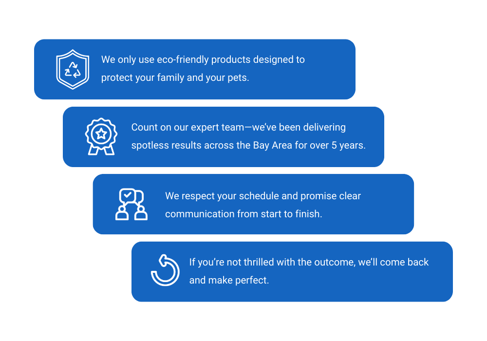 From homes to offices, Bay Area clients choose Ducks Solutions for reliable service, eco-friendly products safe for families and workplaces, and guaranteed results.